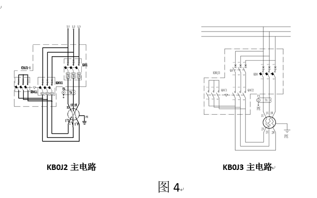 4. KB0J2、KB0J3、KB02J2、KB02J3主電路與普通KB0J、KB02J的接線方式區(qū)別是KB0或KB02主電路接線位置,普通的KB0J、KB02J接線方式:接在電源進線端主電路KB0承受的是線電流In。而采用圖4(KB0J2、KB0J3、KB02J2、KB02J3)分流的接線方式后,KB0或KB02主回路接的位置有一些變化,啟動完成后主開關(guān)KB0或KB02承受的是相電流In/3(見表4)。KB0J2、KB0J3、KB02J2、KB02J3全壓工作時流過每臺主開關(guān)的相電流的計算公式見表4。(電纜的截面積選擇:引至電動機端的電纜截面積承載的電流不小于分流后,流過主開關(guān)工作電流值;引至星三角減壓起動器進線端的(進電源端)電纜截面積承載的電流不小于電動機全壓工作時額定電流值。)