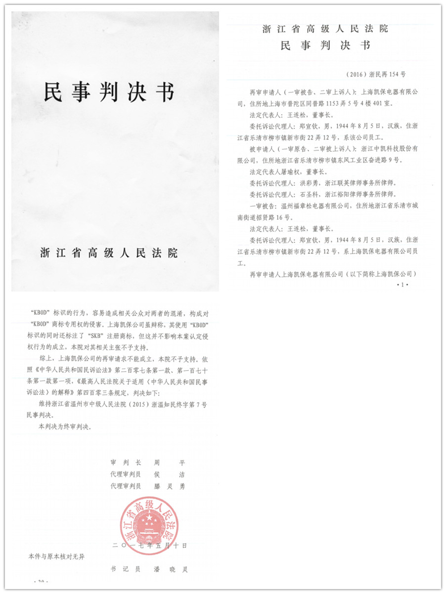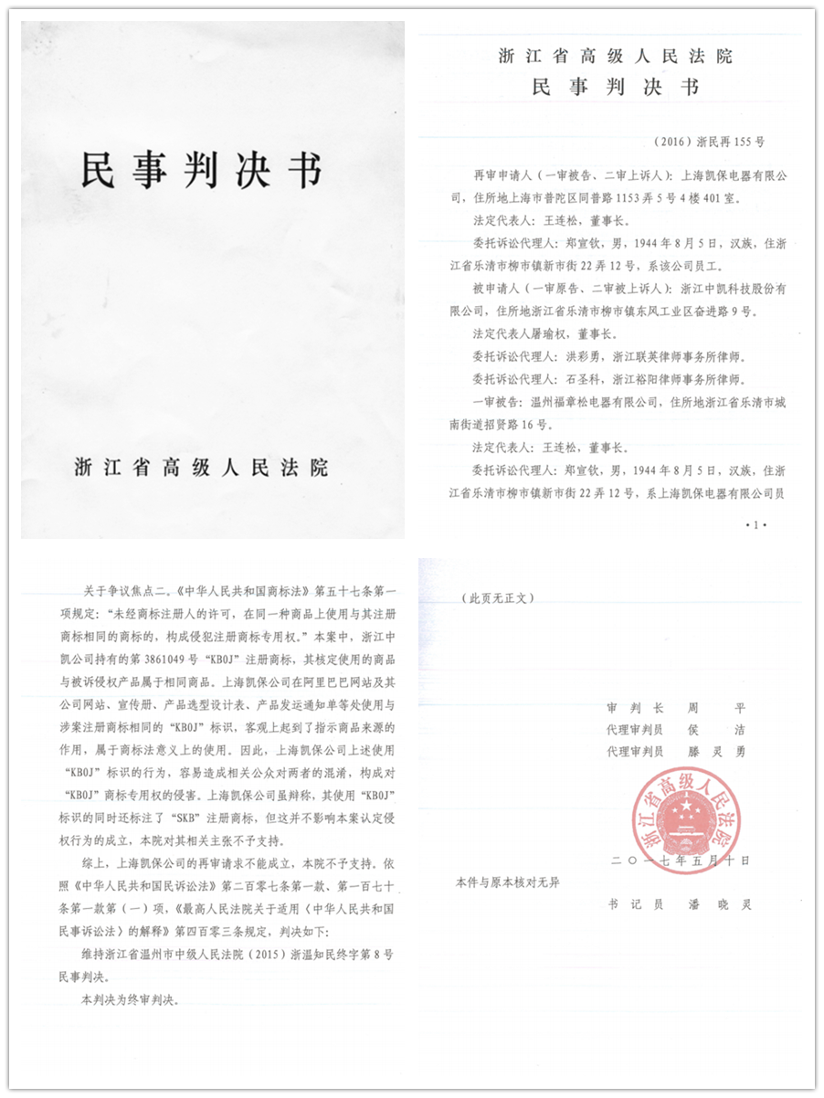 2017年5月10日,浙江省高級人民法院作出終審判決,中凱一場歷時三年的商標(biāo)維權(quán)案終于塵埃落定。本案得從2014年3月說起,因上海凱保長期蓄意侵害中凱商標(biāo)權(quán),在產(chǎn)品包裝盒、產(chǎn)品標(biāo)牌、企業(yè)官網(wǎng)、產(chǎn)品樣本、廣告等媒介平臺上大量使用與中凱KB0、KB0J、KB0D等商標(biāo)相似或近似字樣,并有意作一些誤導(dǎo)消費(fèi)者的宣傳,被中凱訴至法院。樂清市法院受理此案后,通過大量的調(diào)查了解,以大量的事實(shí)證據(jù)為依據(jù),認(rèn)定上海凱保侵權(quán)事實(shí)成立,判令上海凱保停止侵權(quán),賠償損失。上海凱保不服,上訴到溫州市中院,溫州市中院通過對案件的審查,最終在充分的事實(shí)和證據(jù)基礎(chǔ)上作出了維持一審判決的二審判決。上海凱保為達(dá)到其不可告人的目的,使出一套“纏”和“拖”的絕技,對二審法院的判決仍然表示不服,向浙江省高院提出再審申請。省高院受理案件后,開庭再審該案,在大量的事實(shí)和證據(jù)面前,最終作出了維持溫州市中院二審判決的終審判決。這一判決,標(biāo)志著一些別有用心,惡意侵害或蓄意侵占中凱商標(biāo)權(quán)的不法行為的破滅。