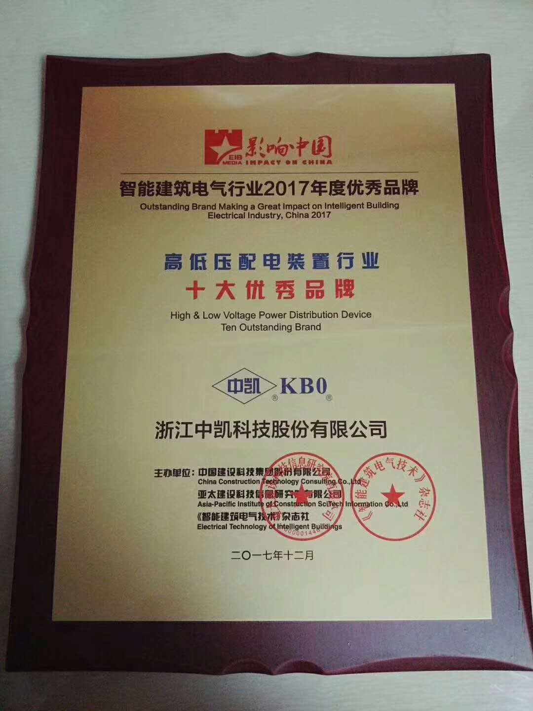 2017年12月19日,從北京傳來好消息,我浙江中凱科技股份有限公司再次被評選為2017年度影響中國智能建筑電氣行業(yè)高低壓配電裝置十大優(yōu)秀品牌,這是我公司自2016年以來,連續(xù)第二次獲此殊榮。本次評選的2017年度高低壓配電裝置十大優(yōu)秀品牌分別由浙江中凱和ABB、施耐德、西門子、常熟開關等業(yè)內十家領軍企業(yè)斬獲。