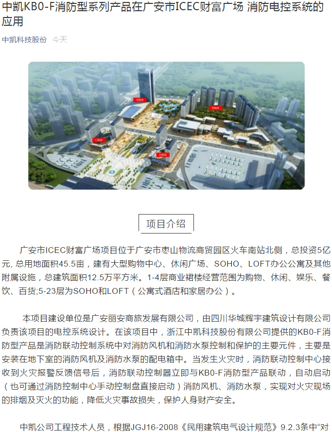 中凱KB0-F消防型系列產(chǎn)品在廣安市ICEC財(cái)富廣場(chǎng) 消防電控系統(tǒng)的應(yīng)用