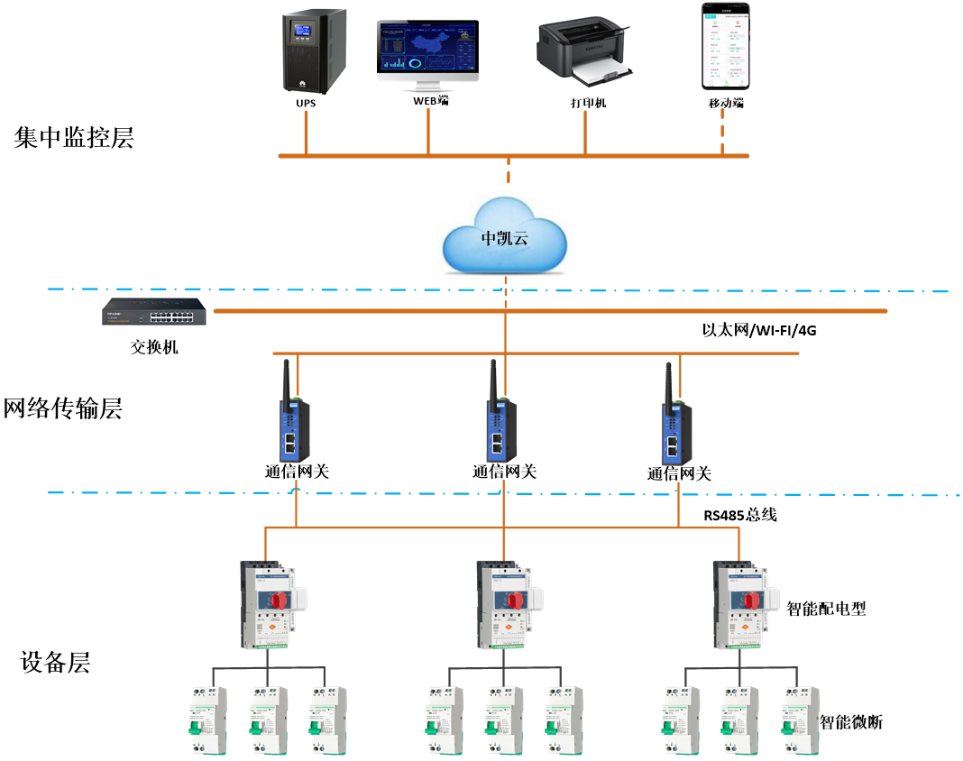 中凱智能配電系統(tǒng)基于中凱云平臺(tái)實(shí)現(xiàn),不僅可以滿足智能配電的需求,還可以同時(shí)實(shí)現(xiàn)泛在物聯(lián)的遠(yuǎn)程管理,整合元件、網(wǎng)關(guān)及系統(tǒng),實(shí)現(xiàn)全面的智能配電解決,同時(shí)具有多種類型的KB0智能配電型控制與保護(hù)開(kāi)關(guān)電器及ZB3Z智能小型斷路器等智能化元件設(shè)備和系統(tǒng)解決方案,為用戶提供豐富的、個(gè)性化的、可定制的智能系統(tǒng)解決方案。