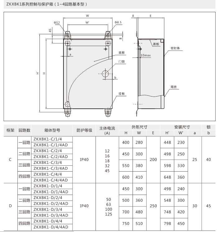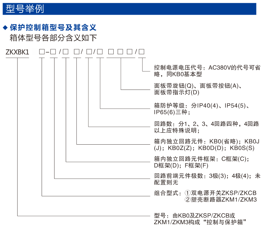 其以KB0作為主開關,配用不同的防護等級箱體,可構成防護等級為IP40、IP54、IP65等多種等級的保護控制箱ZKXBK1,適用于戶外以及遠程單獨負載的控制與保護。由KB0、KB0-F、KB0-G、KB0S3、KB0D、KB0N、KB0J、KB0J2、KB0Z等組合構成單回路、多回路等多種形式;根據(jù)需要,在箱體面板上可配備選擇開關、旋鈕、按鈕、信號燈等。與傳統(tǒng)的各種保護箱、綜合式、電磁起動器相比,具有體積小、重量輕、操作安全可靠、接線便捷、防護等級高等特點,且可以選擇就地控制、遠程控制和二者兼有的方式進行操作,是替代傳統(tǒng)產(chǎn)品的極佳選擇。